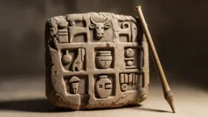Foi nesse contexto de efervescência administrativa e econômica que a escrita emergiu. Os primeiros “escritores” não eram bardos, poetas ou filósofos em busca de imortalizar narrativas épicas, mas sim contadores, administradores e escribas. Suas ferramentas eram estiletes de junco e pequenas tábuas de argila úmida, e seu objetivo primordial era registrar transações, impostos, inventários de bens e alocações de recursos. As primeiras inscrições, datadas de cerca de 3400 a.C. em cidades sumérias como Uruk, eram predominantemente pictográficas, ou seja, representavam objetos por meio de desenhos simplificados. Um desenho de uma cabeça de boi significava “boi”, um jarro significava “cerveja” ou “óleo”, e assim por diante. Essas representações eram diretas e funcionais, projetadas para uma compreensão rápida e inequívoca no contexto comercial e administrativo.