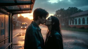 O primeiro beijo aconteceu numa tarde chuvosa, no ponto de ônibus em frente ao colégio. O som da chuva disfarçava a pressa e o medo. Foi breve, mas intenso o suficiente para transformar o que era curiosidade em promessa.