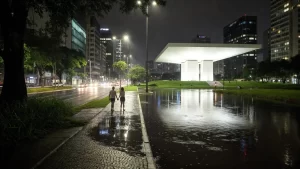 Naquela noite, São Paulo parecia menos cidade e mais lembrança de algo esquecido. Chovia sem pressa. A água descia pelas calçadas da Avenida Paulista e, atrás do Masp, uma pequena enchente se formava — discreta, quase poética — como se o antigo rio Saracura tentasse, mais uma vez, reaparecer sob o concreto. Ali, onde o rio dorme invisível sob o asfalto da Rua Garcia Fernandes e das vielas da Bela Vista, a cidade parecia respirar pelo subsolo.